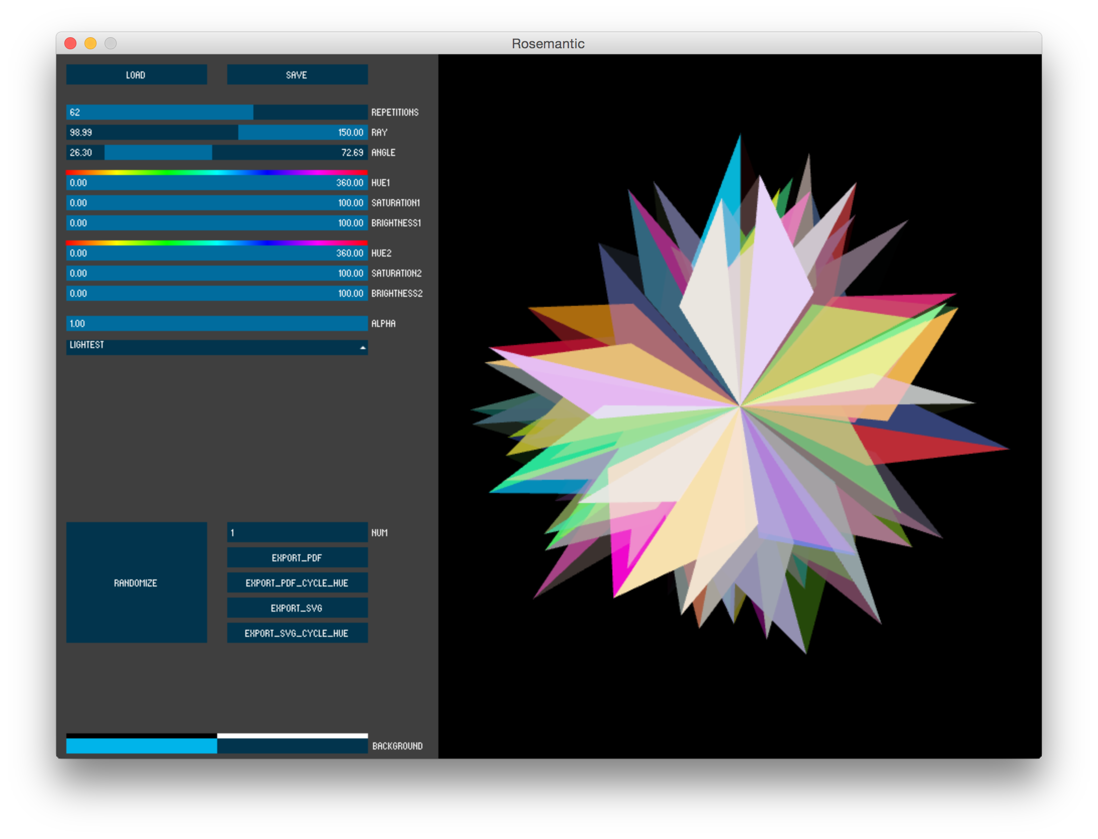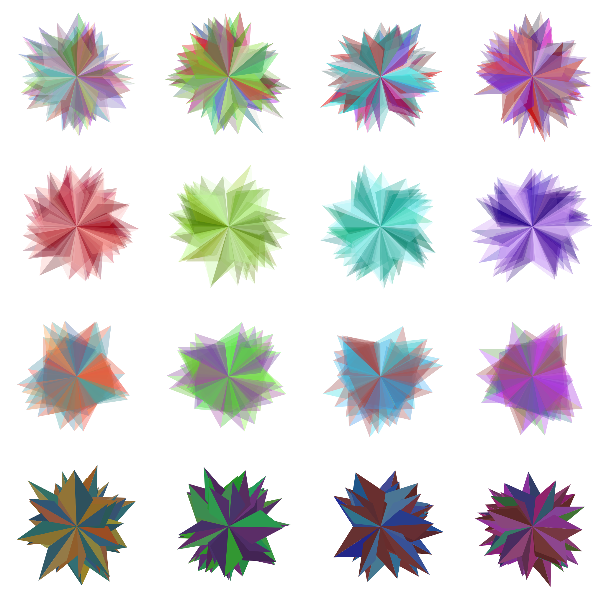 Creates geometric shapes flattening a multidimensional vector averaging process to a 2D surface, resembling holographic roses.